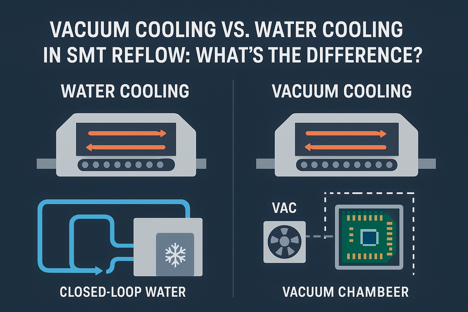 In modern SMT production, temperature control plays a key role in ensuring stable solder joints and high overall line efficiency. While convection heating receives most of the attention in a reflow oven, the cooling process is just as critical. Today, two cooling methods are commonly used in advanced SMT reflow systems: vacuum cooling and water cooling.